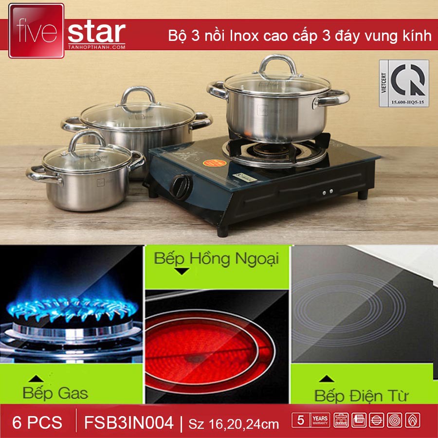 - Điểm đặc biệt của bộ 3 nồi Fivestar FSB3IN004 là kết cấu vững chắc với 3 đáy. Đáy nồi thiết kế rộng, phẳng, dập 3 lớp (inox 430 – nhôm – inox 430). Đặc tính của inox là ít phản ứng với thức ăn, an toàn sức khỏe, đặc tính của nhôm là hấp thu nhiệt tốt, tỏa nhiệt đều, nấu thức ăn chín nhanh, tiết kiệm năng lượng tối ưu.