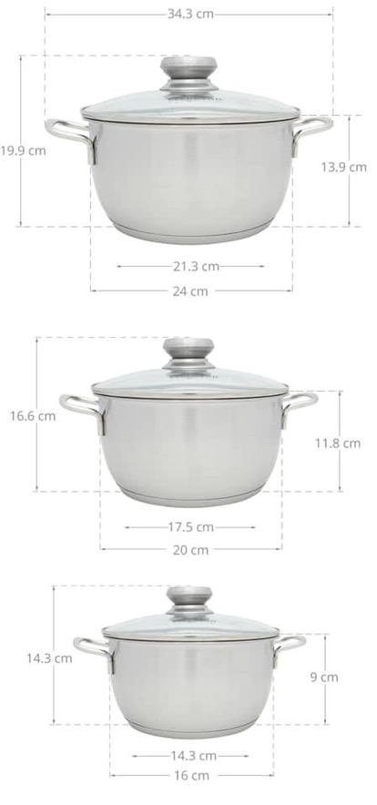 Bộ 3 Nồi Inox 3 Đáy Nắp Kính Fivestar FS06CG có mẫu mã thiết kế đơn giản mà tiện dụng, thương hiệu chất lượng tốt.Bộ nồi gồm có 3 sản phẩm với đường kính là 16 cm, 20 cm, 24 cm, bạn có thể dùng nồi nhỏ để nấu cháo cho bé, nồi trung để kho thịt, sườn tầm 0.5 kg, nồi lớn nhất nấu canh hoặc luộc gà cỡ 1.5 kg.
