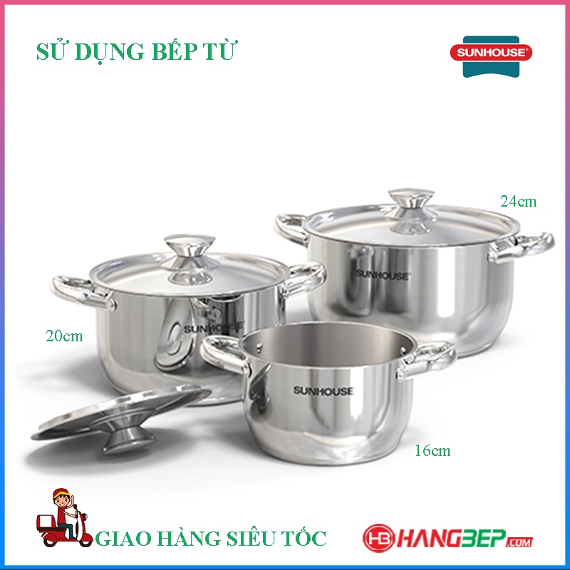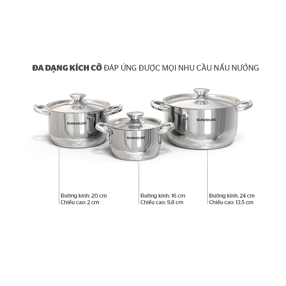 Nhà cửa & Đời sống > Dụng cụ nhà bếp > Nồi || Bộ 3 nồi inox 3 đáy Sunhouse SHG302 (new_model 10.2021) 16cm/20cm/24cm - Sử dụng bếp từCòn hàng