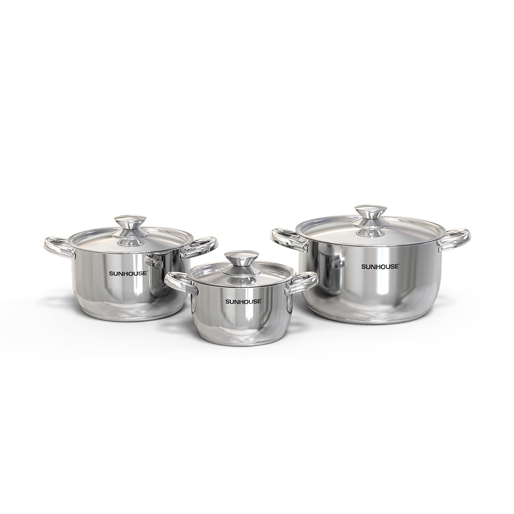 ✅ Bộ nồi inox 3 đáy SUNHOUSE SHG302 sử dụng được với mọi loại bếp, kể cả bếp từ. Bộ sản phẩm gồm 3 nồi với đường kính 16 – 20 – 24 cm phù hợp với nhu cầu nấu nướng của mọi gia đình. Nồi nhỏ 16cm thích hợp để luộc trứng, kho thịt, trong khi nồi cỡ trung 20 cm có thể nấu canh cho 2 – 4 người còn nồi lớn 24cm có thể luộc gà, nấu canh hoặc lẩu cho 3 – 5 người.