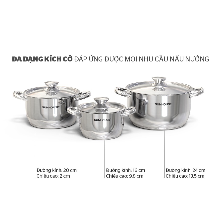 Nhà cửa & Đời sống > Dụng cụ nhà bếp > Nồi || Bộ 3 nồi inox 3 đáy Sunhouse SHG302 (new model 10.2021) 16cm/20cm/24cm - Sử dụng bếp từCòn hàng