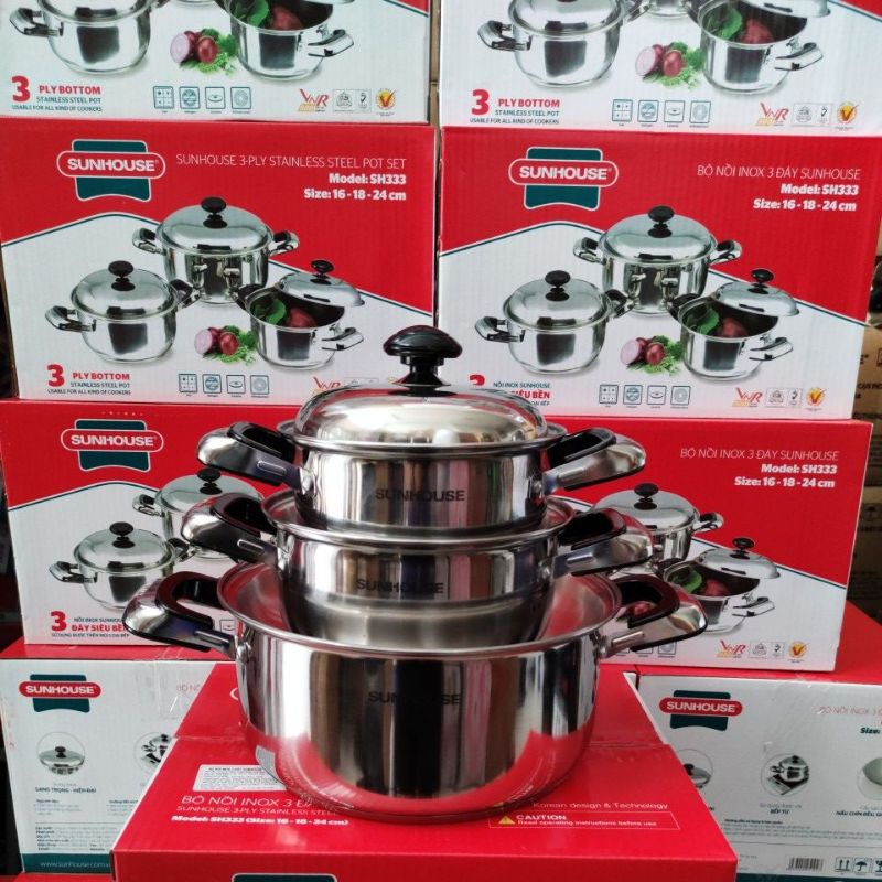 Bộ nồi inox 3 đáy SUNHOUSE SH333 là một trong những sản phẩm chất lượng từ SUNHOUSE.Với chất liệu inox sáng bóng, an toàn, vung inox dễ vệ sinh, quai núm inox kết hợp nhựa an toàn, sản phẩm còn có 3 lớp đáy dày, giúp nhiệt lượng tỏa đều, món ăn chín ngon hơn. Bộ sản phẩm gồm 03 nồi với đường kính 16 - 18 - 24cm giúp bạn sử dụng linh hoạt để chế biến những món ăn thơm ngon và bổ dưỡng cho gia đình.
