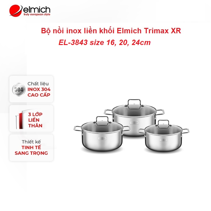 Nhà cửa & Đời sống > Dụng cụ nhà bếp > Nồi || Bộ 3 nồi inox 304 cao cấp 3 đáy liền khối Elmich Trimax XR EL-3843 size 16, 20, 24cmCòn hàng