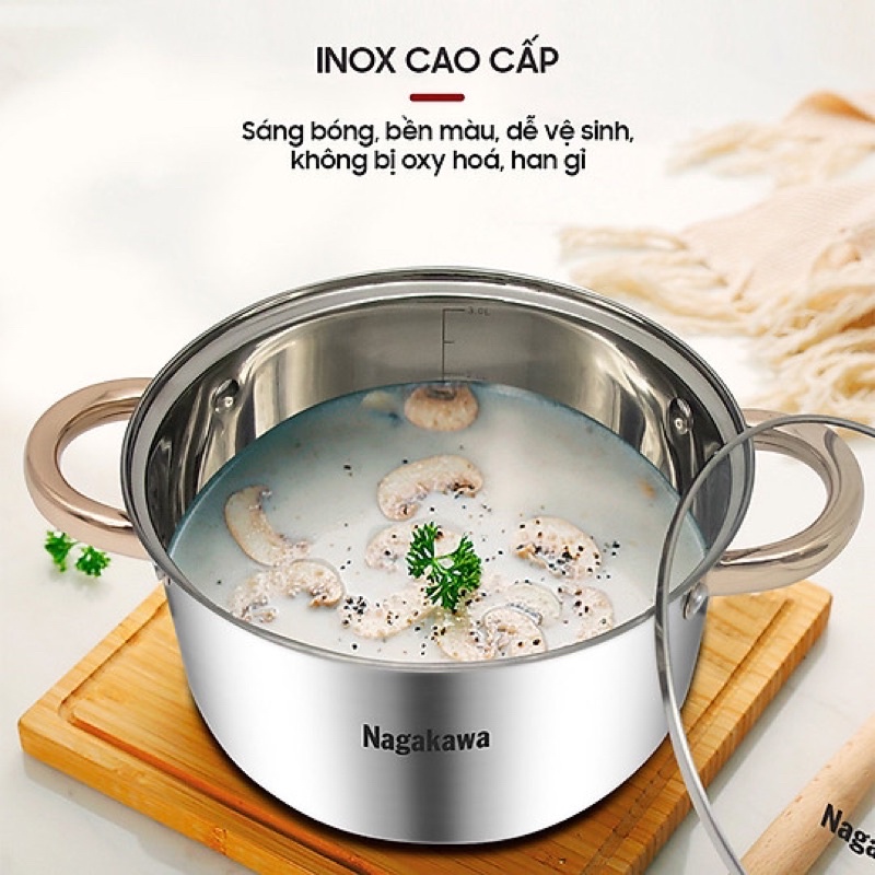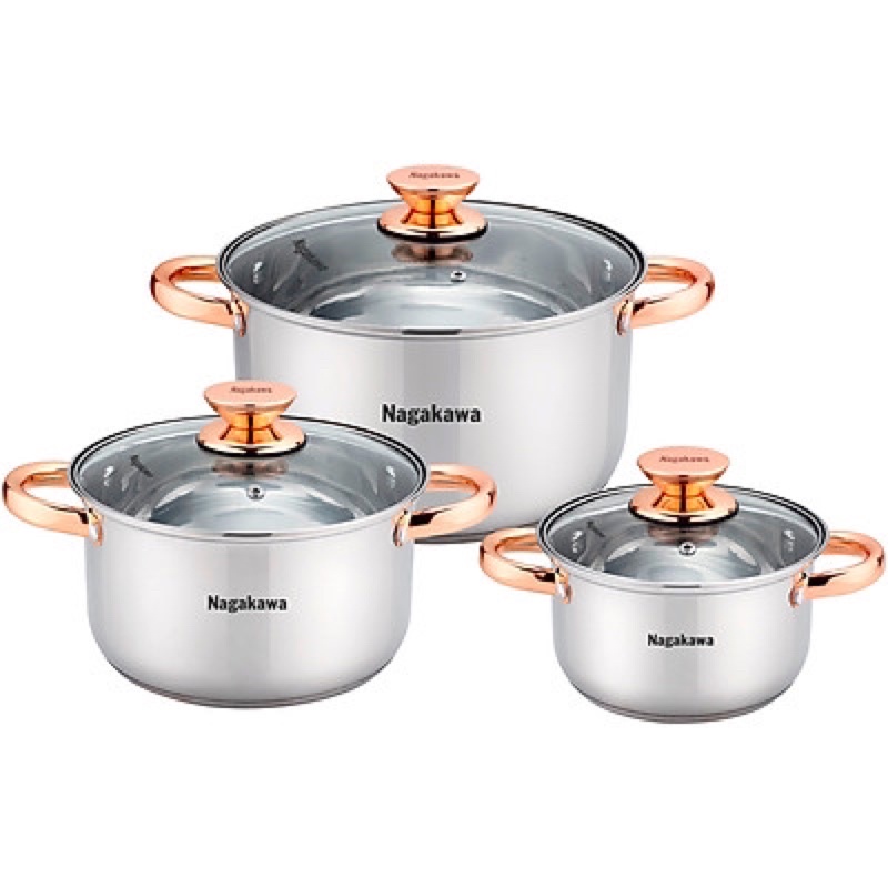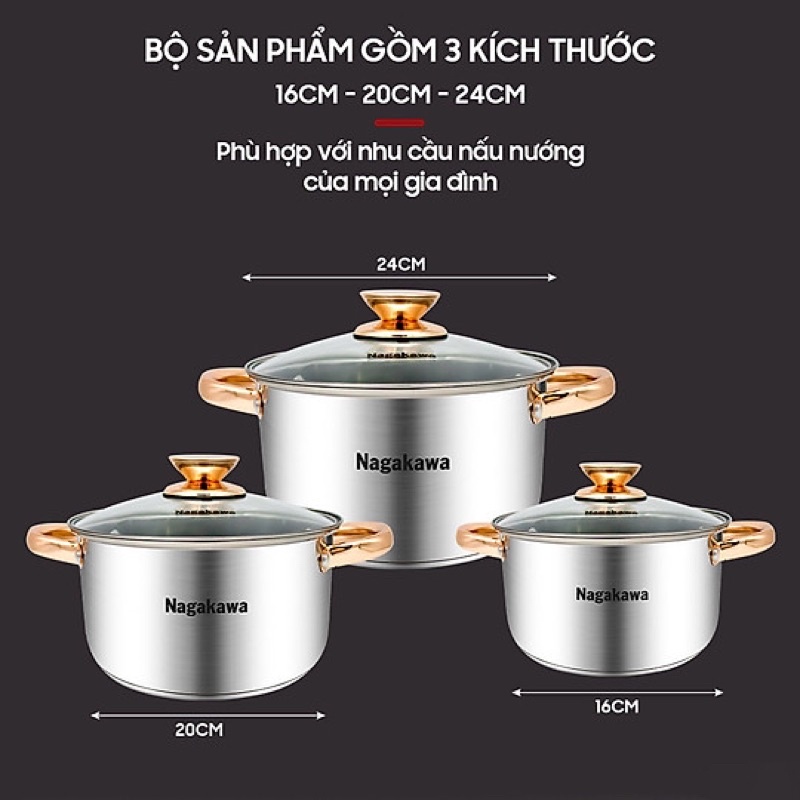 Nhà cửa & Đời sống > Dụng cụ nhà bếp > Nồi || Bộ 3 nồi inox 4 đáy Nagakawa NAG1306 (16cm, 20cm, 24cm) - Quai mạ vàng - Dùng trên mọi loại bếp - Hàng Chính HãngCòn hàng