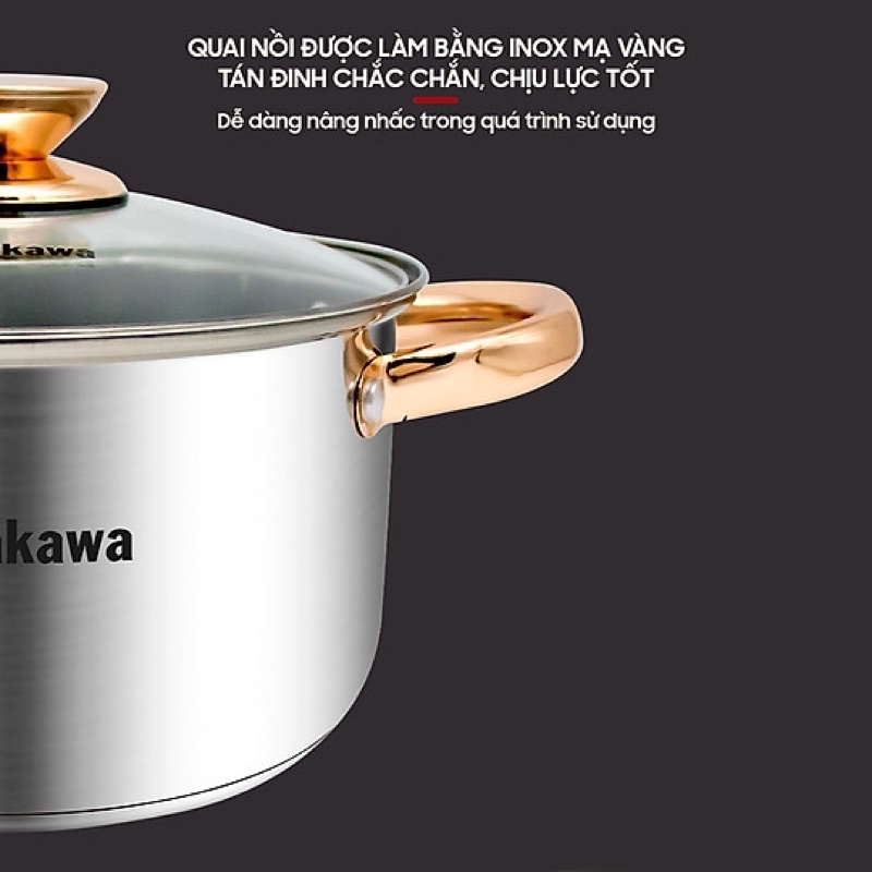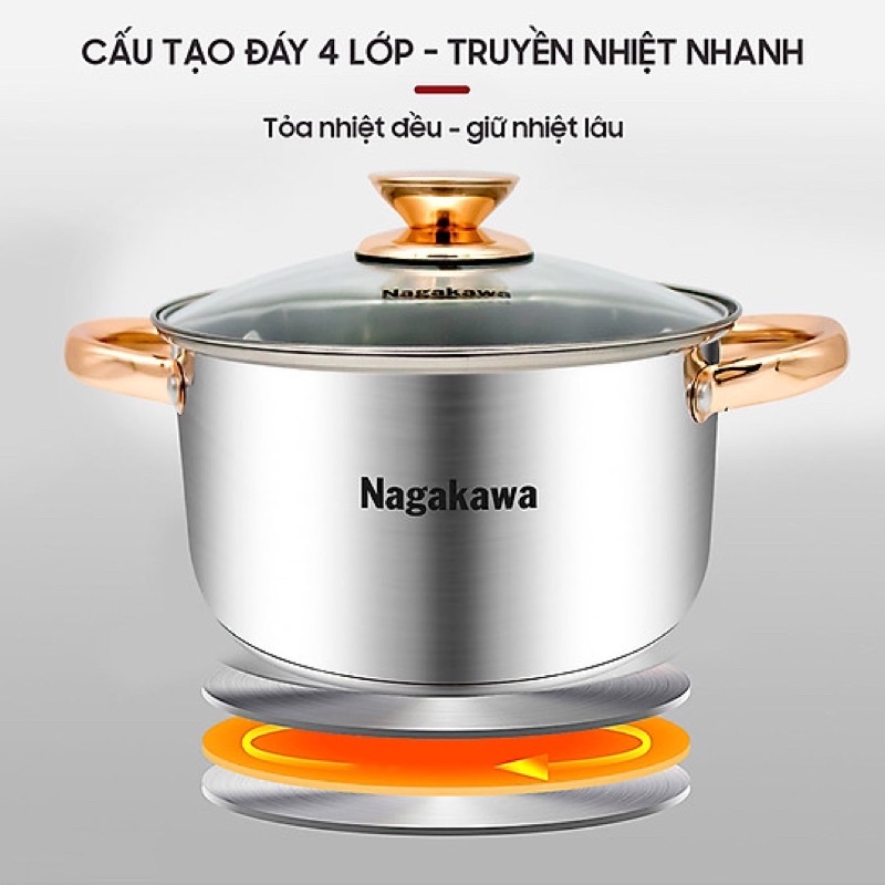 Giới thiệu Bộ 3 nồi inox 4 đáy Nagakawa NAG1306 (16cm, 20cm, 24cm) - Quai mạ vàng - Dùng trên mọi loại bếp - Hàng Chính Hãng