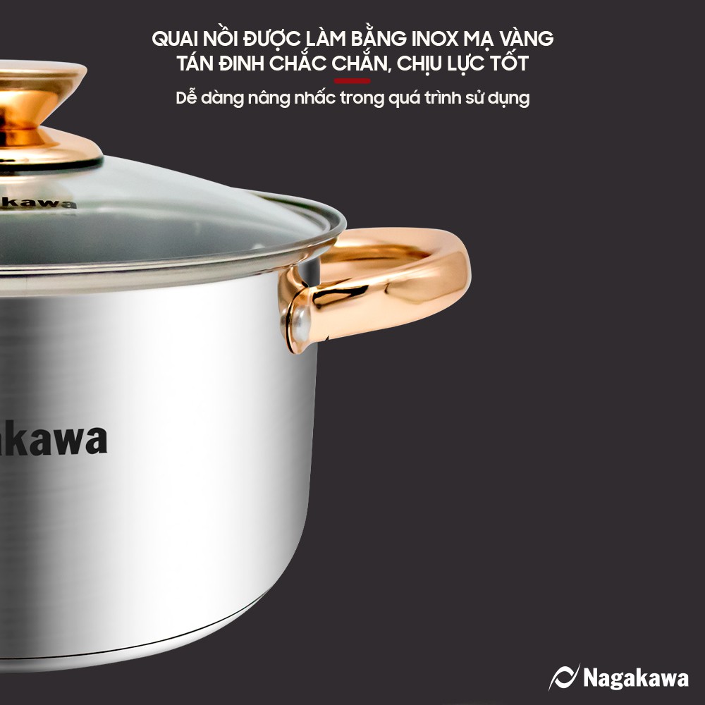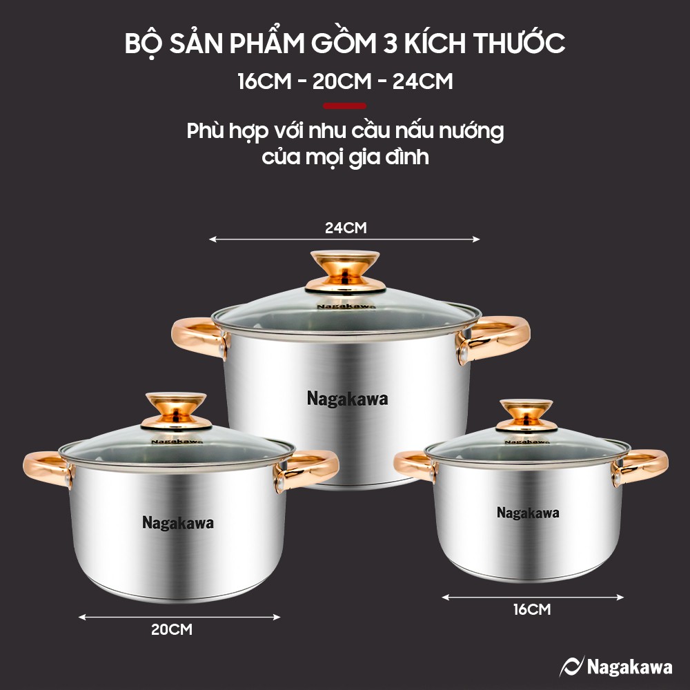 Bộ 3 nồi inox 4 đáy Nagakawa NAG1306 (16cm, 20cm, 24cm) - Quai mạ vàng - Dùng trên mọi loại bếp - Hàng Chính Hãng