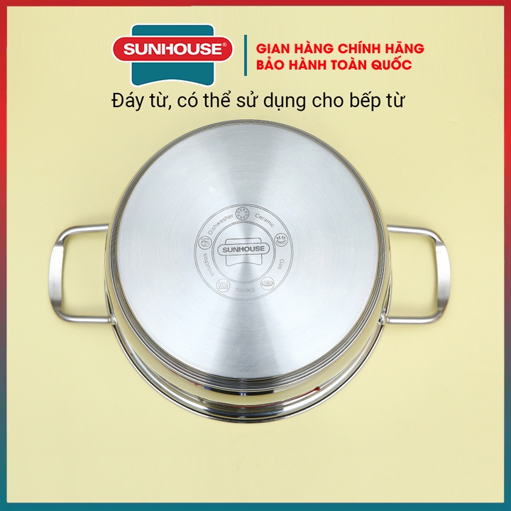 - Nồi inox 5 đáy SUNHOUSE: sử dụng được với mọi loại bếp, kể cả bếp từ. Kích thước 16cm - 20cm - 24cm thích hợp để luộc trứng, kho thịt và nấu lượng thức ăn nhỏ dành cho 2 – 3 người.