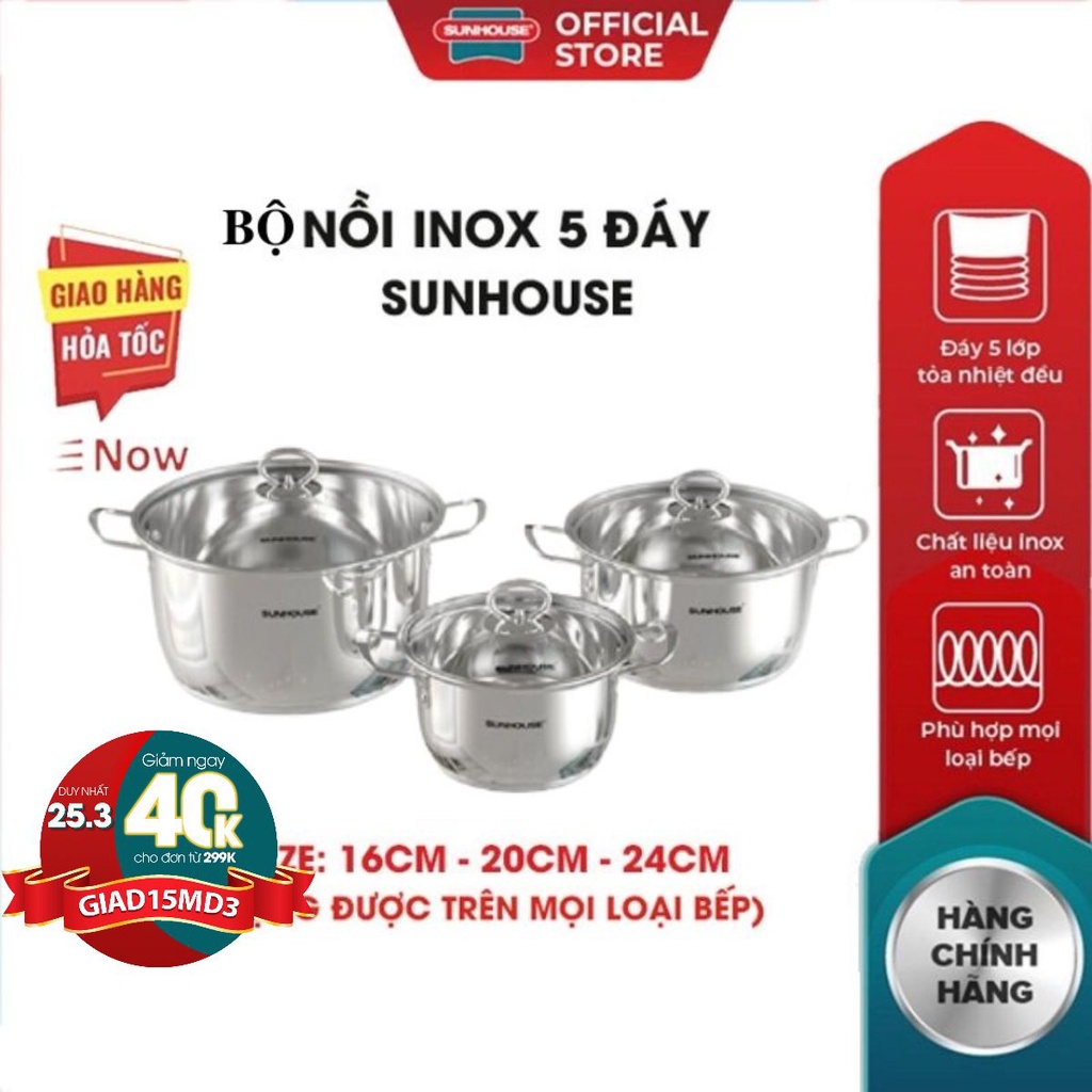 Bộ 3 nồi inox 5 đáy bếp từ SUNHOUSE 16 20 24cm dùng mọi loại bếp truyền nhiệt nhanh, tỏa nhiệt đều, giữ nhiệt tốt