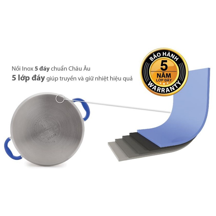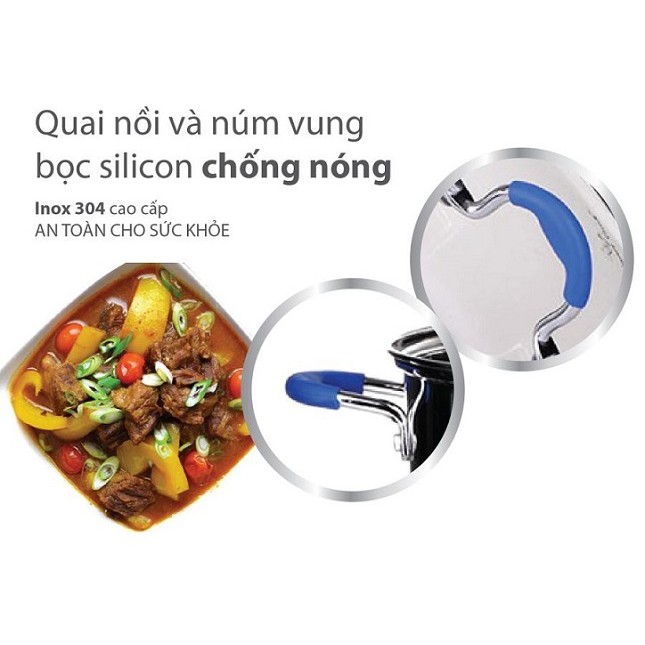 - Quai nồi được làm từ Inox 304, nắp kính chịu nhiệt an toàn chống trào, quai nồi và núm vung bọc silicon cách nhiệt, chống nóng bảo vệ an toàn cho người sử dụng.