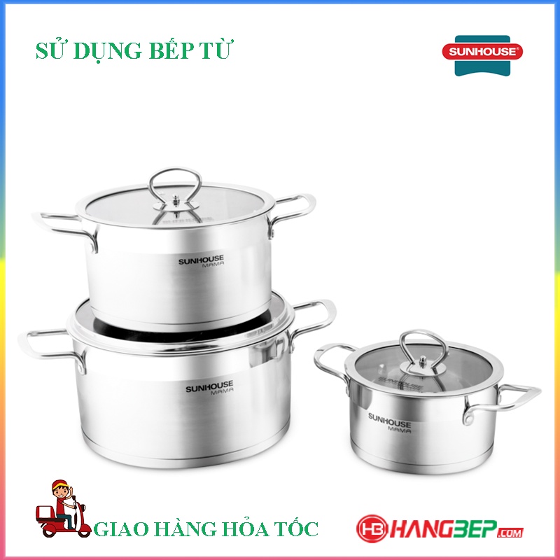 Bộ nồi inox 5 đáy SUNHOUSE MAMA SH784 sử dụng được với mọi loại bếp, kể cả bếp từ. Bộ sản phẩm gồm 3 nồi với đường kính 16cm - 20cm - 24cm phù hợp với nhu cầu nấu nướng của mọi gia đình. Nồi nhỏ 16cm thích hợp để luộc trứng, kho thịt, nồi cỡ trung 20cm để nấu canh cho 2-4 người và nồi lớn 24cm có thể luộc gà, nấu canh hoặc lẩu cho 3-5 người