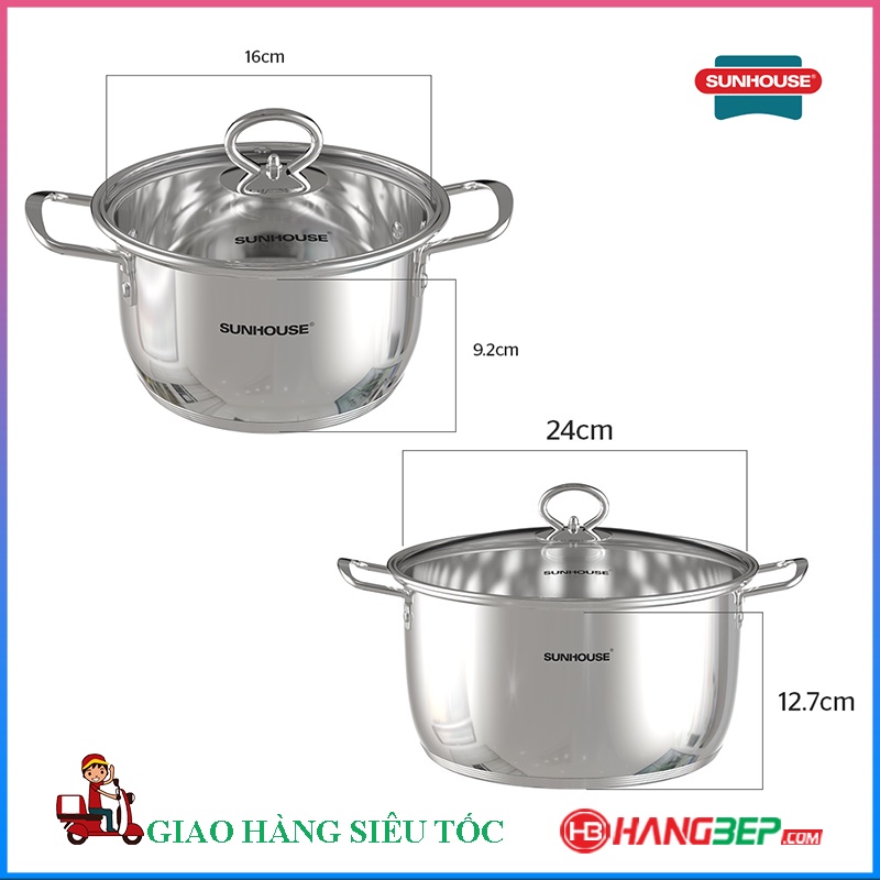 ✅ Bộ nồi inox 5 đáy SUNHOUSE SHG788 sử dụng được với mọi loại bếp, kể cả bếp từ. Bộ sản phẩm gồm 3 nồi với đường kính 16cm - 20cm - 24cm phù hợp với nhu cầu nấu nướng của mọi gia đình. Nồi nhỏ 16cm thích hợp để luộc trứng, kho thịt, nồi cỡ trung 20cm để nấu canh cho 2-4 người và nồi lớn 24cm có thể luộc gà, nấu canh hoặc lẩu cho 3-5 người.
