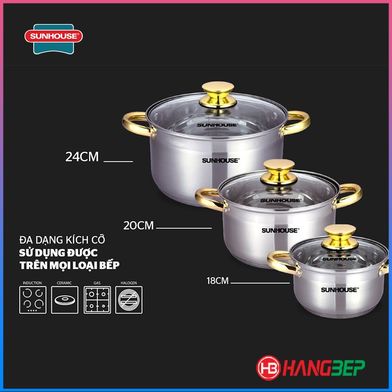 Bộ 3 nồi inox 5 đáy từ Sunhouse SH781 (16cm/20cm/24cm)