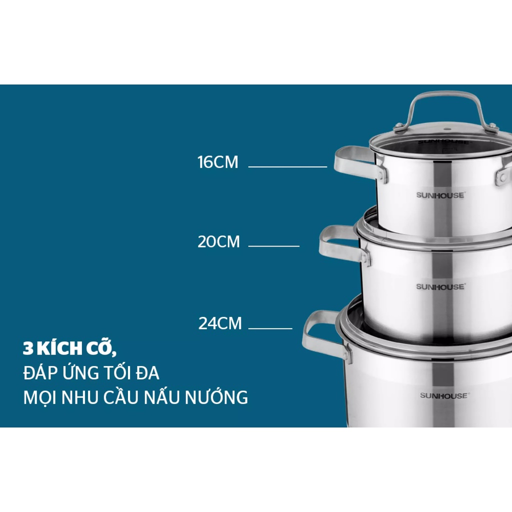 Bộ 3 nồi inox cao cấo 5 đáy bếp từ SUNHOUSE 16 20 24 CM (dùng được trên mọi loại bếp) chính hãng bảo hành toàn quốc