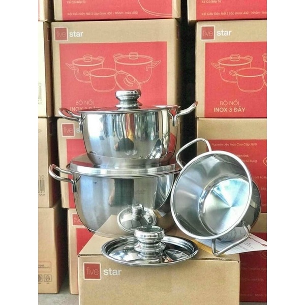 Bộ nồi inox cao cấp Five Star - Hàng Việt Nam chất lượng cao.- Sản phẩm 3 cái với 3 dung tích khác nhau được sản xuất theo công nghệ châu Âu