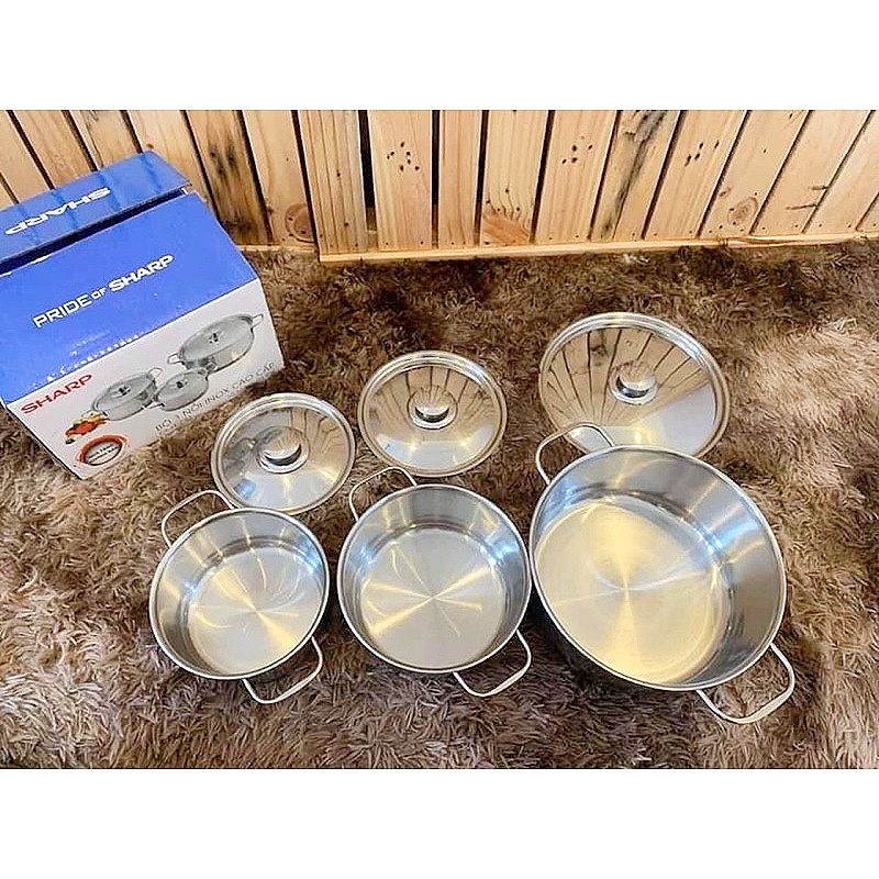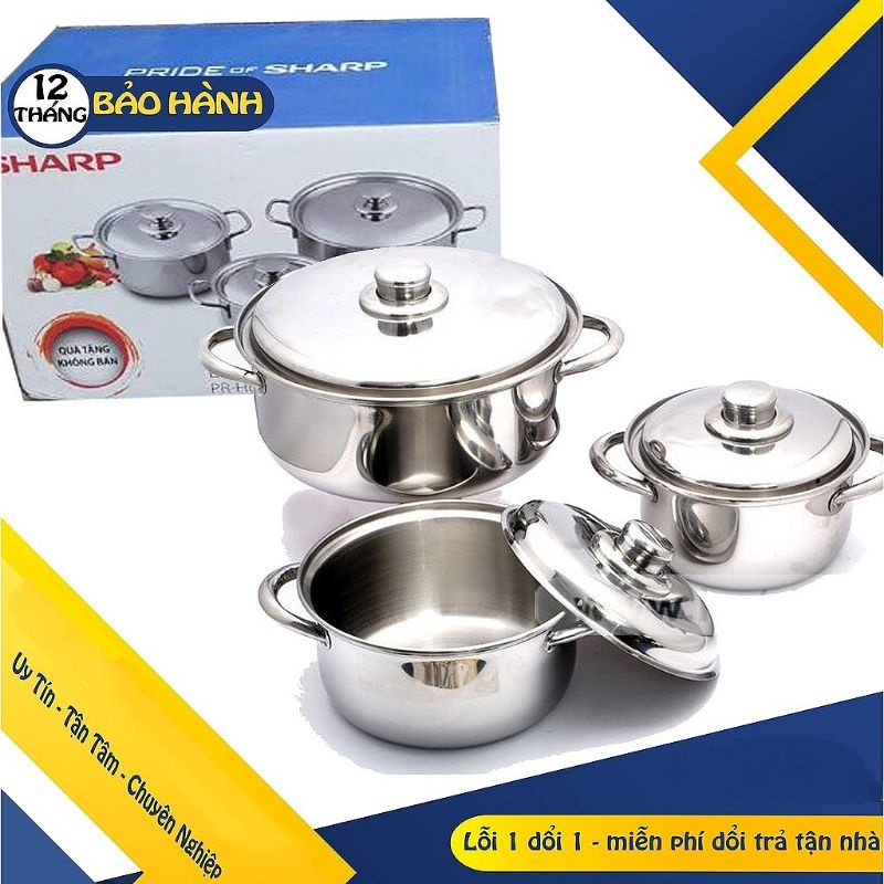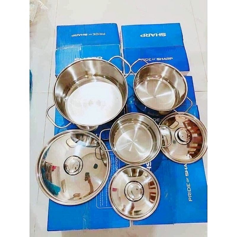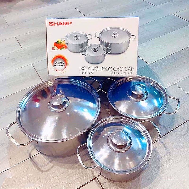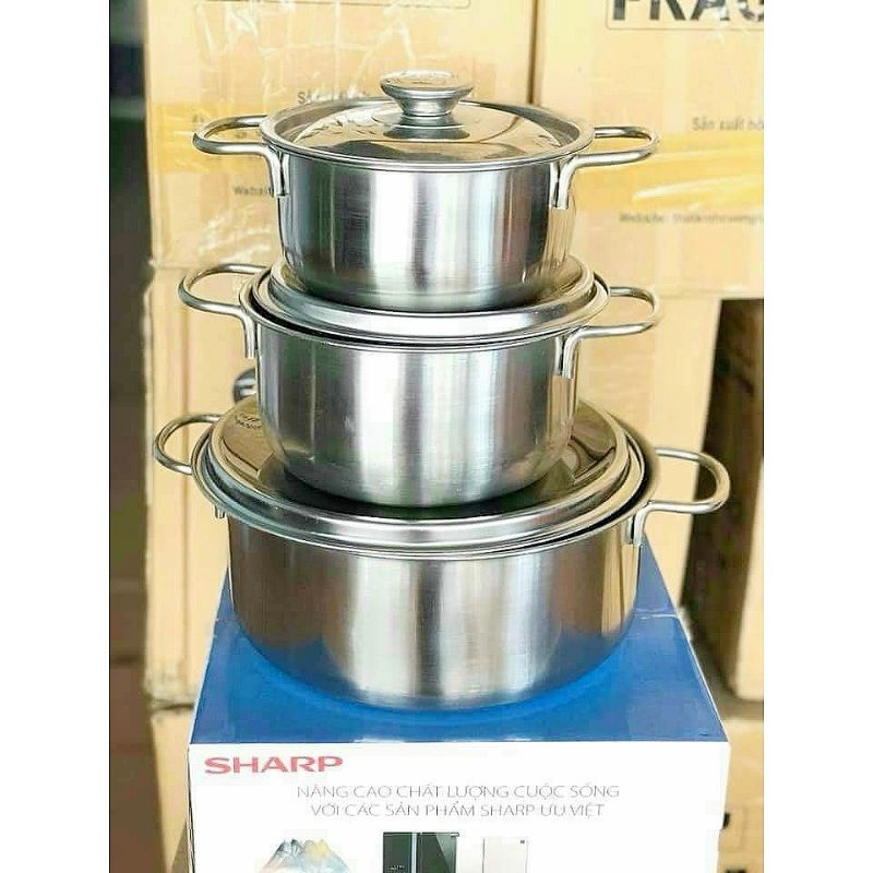 Bộ 3 nồi inox SHARP 1 đáy dùng được cho cả bếp từ và bếp gasThi trường giá khoảng 300-400k 1 bộ , cai này là e ôm dc hàng khuyến mại nên mới co giá này khách nha . Chỉ #269k được tận 3 cái