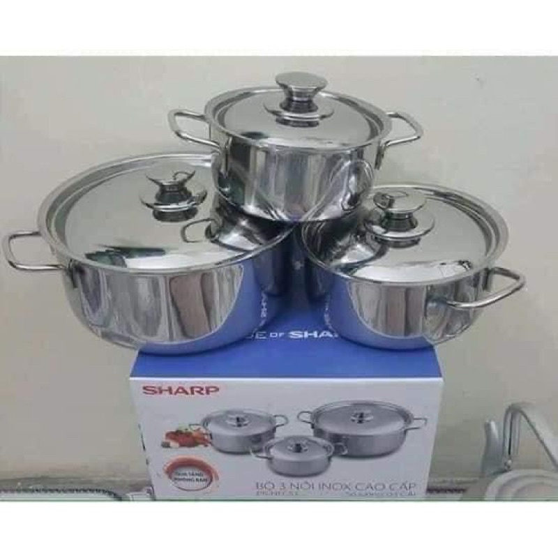 - ❗️Bộ 3 nồi Inox Sharp có khả năng chống oxy hóa cực tốt, chống cháy khét, dễ chùi rửa, bảo vệ sứa khỏe cho người thân và gia đình. Đáy nồi 1 đáy giúp thu nhiệt nhanh, tỏa nhiệt đều, giữ nhiệt lâu, tiết kiệm gas, thời gian nấu