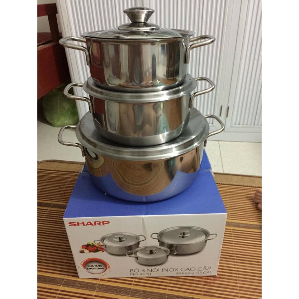 Bộ 3 nồi inox sharp cao cấp được làm bằng chất liệu Inox sáng bóng, Sang trọng, Bền đẹp với giá cả phù hợp với thu nhập của đại đa số người dân.