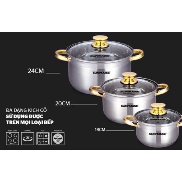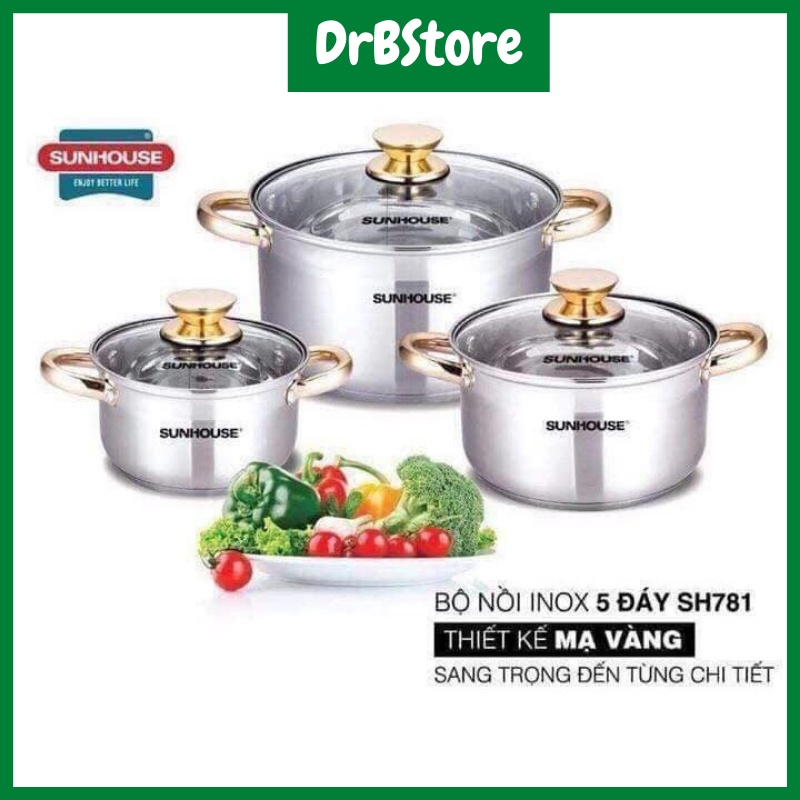 Bộ 3 Nồi Inox SUNHOUSE 5 Đáy Cao Cấp SH 781 Quai Núm Vàng Dùng Được Cho Các Loại Bếp