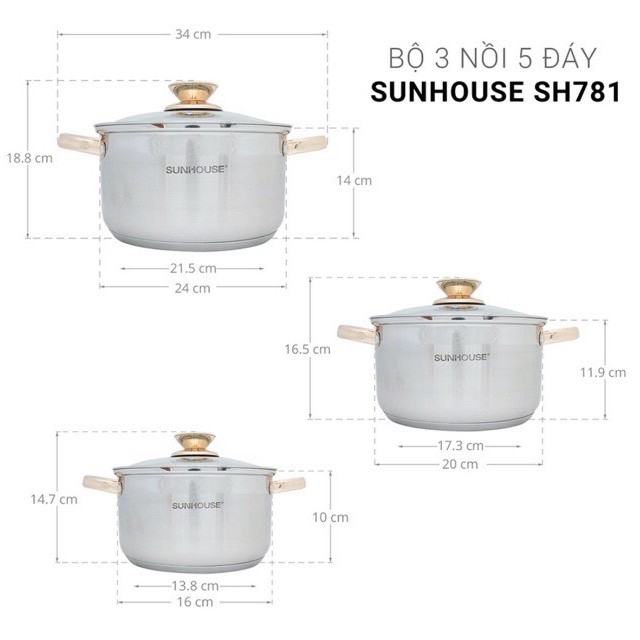 Giới thiệu Bộ 3 Nồi Inox SUNHOUSE 5 Đáy Cao Cấp SH 781 Quai Núm Vàng Dùng Được Cho Các Loại Bếp