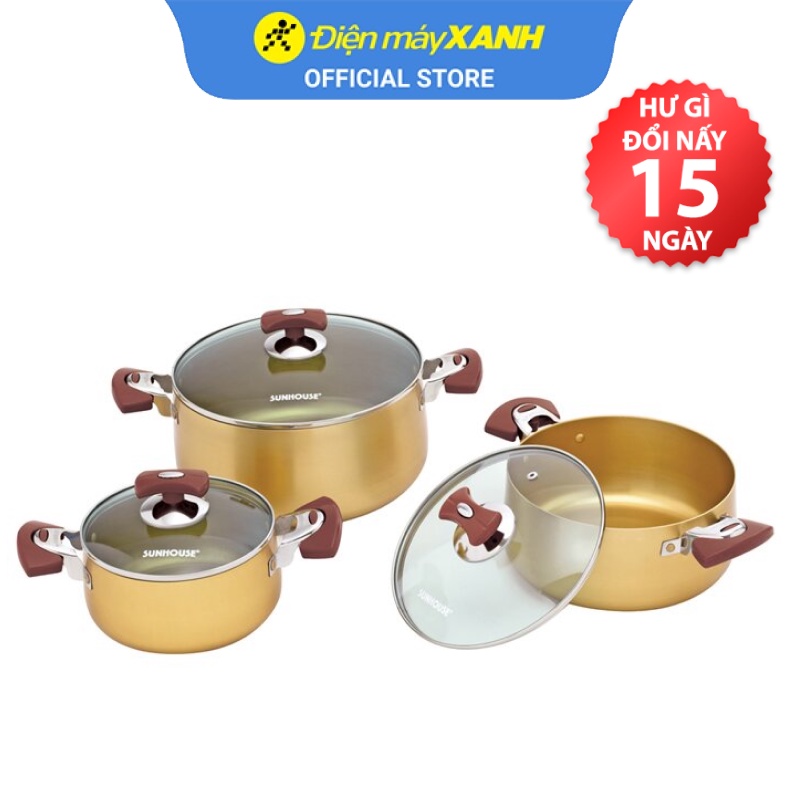 • Bộ 3 nồi Sunhouse SH6634 được sản xuất tại Việt Nam, màu vàng đồng nổi bật, đẹp mắt