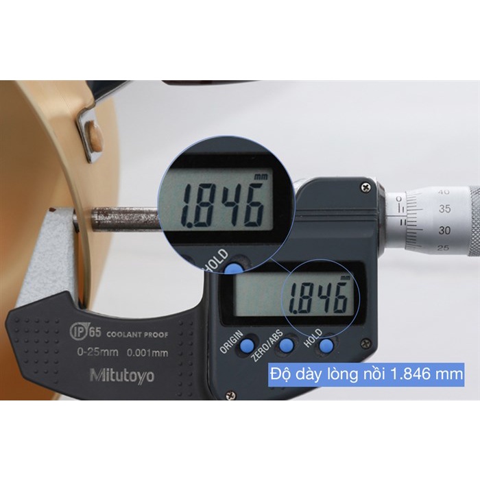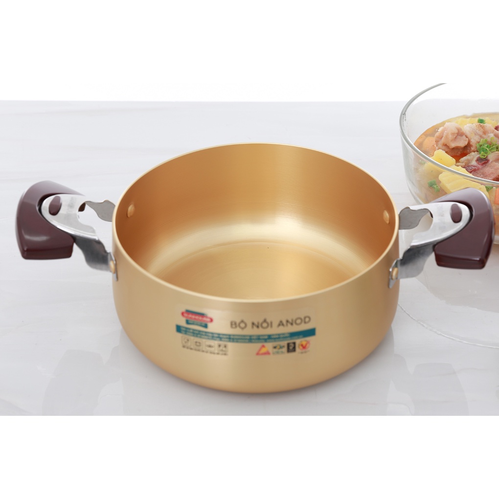 • Nồi làm bằng chất liệu hợp kim nhôm, dày hơn 1.8 mm, bề mặt được xử lý Anodizing nên có độ cứng, bền cao