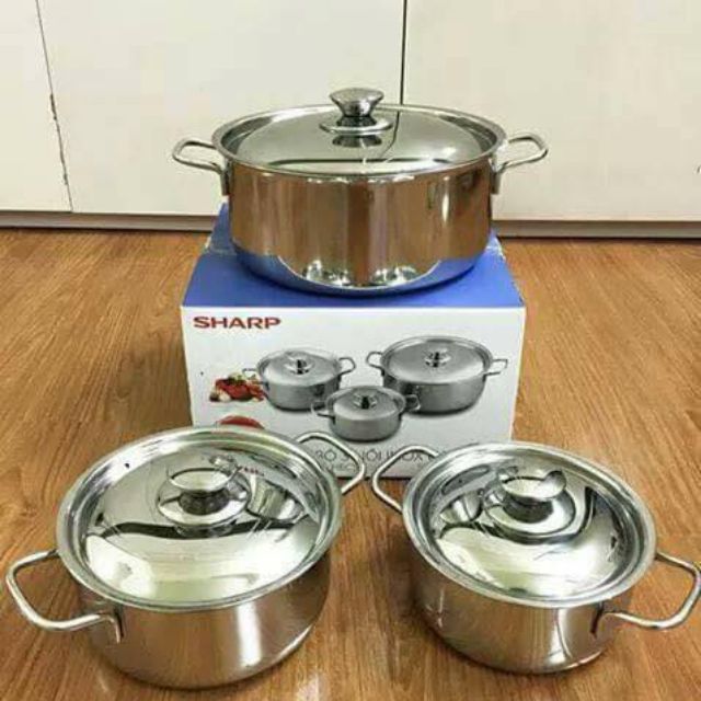 - Bộ 3 nồi Inox Sharp có khả năng chống oxy hóa cực tốt, chống cháy khét, dễ chùi rửa, bảo vệ sứa khỏe cho người thân và gia đình. Đáy nồi 1 đáy giúp thu nhiệt nhanh, tỏa nhiệt đều, giữ nhiệt lâu, tiết kiệm gas, thời gian nấu.