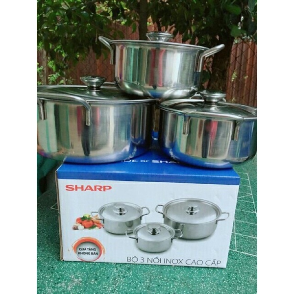 - Bộ 3 nồi Inox Sharp có khả năng chống oxy hóa cực tốt, chống cháy khét, dễ chùi rửa, bảo vệ sứa khỏe cho người thân và gia đình. Đáy nồi 1 đáy giúp thu nhiệt nhanh, tỏa nhiệt đều, giữ nhiệt lâu, tiết kiệm gas, thời gian nấu.Bộ 3 nồi sharp hàng quà tặng, về nhiều lắm ah