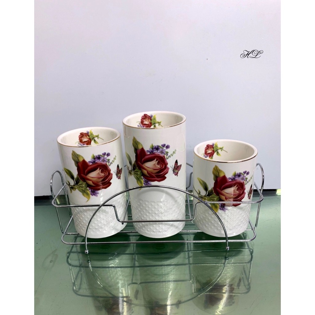 Nhà cửa & Đời sống > Bộ đồ bàn ăn > Bộ dao kéo || Bộ 3 ống cắm đũa sứ hoa (kèm giá inox)Còn hàng