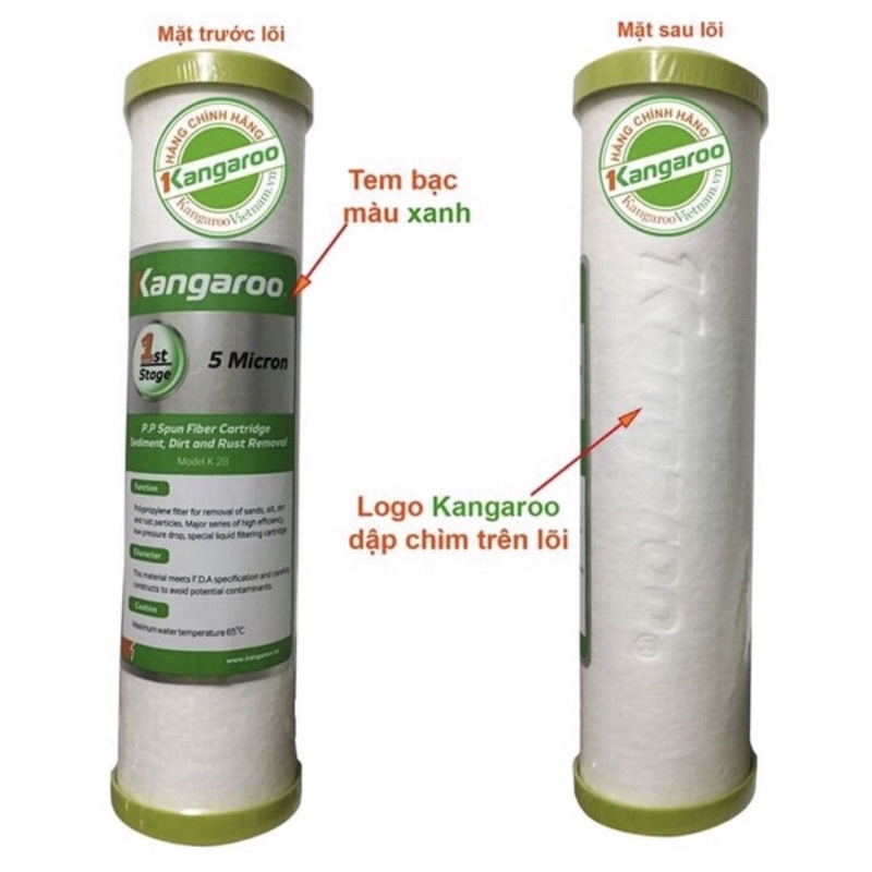 - Thân lõi lọc có logo Kangaroo dập chìm và đầu nhựa bịt lõi lọc nước sẽ có chữ Kangaroo dập nổi