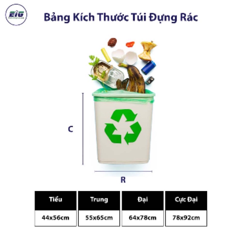 ☘️ Túi đựng rác EIG 3 màu được làm vật liệu có nguồn gốc thực vật tái tạo và polyme sinh học. Giúp túi có bộ dẻo và độ bền cao. Có khả năng chứa được các rác thải nhọn, nặng mà không bị thủng, rách. Dễ dàng phân hủy từ 3 đến 6 tháng trong môi trường sinh học.🌸 Kích Thước Túi Đựng Rác EIG 3 màu