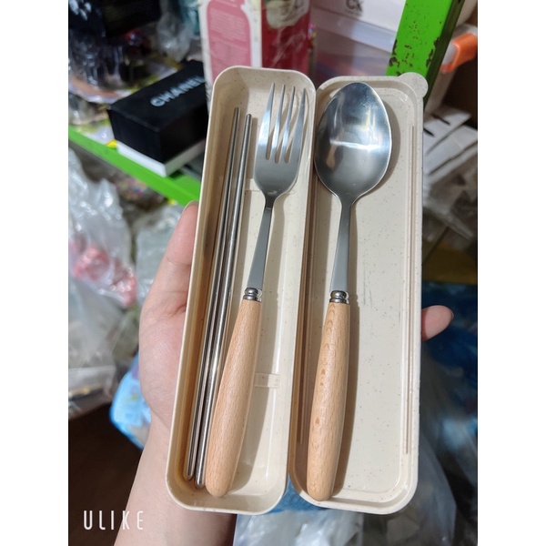 ❤️❤️❤️ Bộ 3 Thìa Dĩa Đũa Inox Cán Gỗ Hộp Lúa Mạch( đợt này e về hàng đũa inox khách nha )