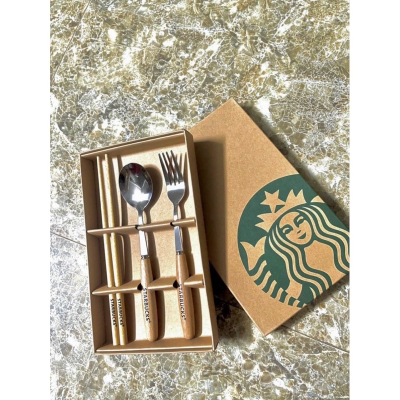 Set 3 sản phẩm muỗng, đũa, nĩa in hình Starbuck làm bằng inox 304 và gỗ, hoàn thiện đẹp, chắc chắn.