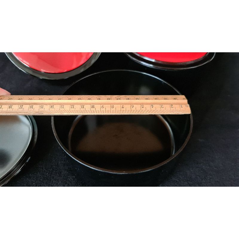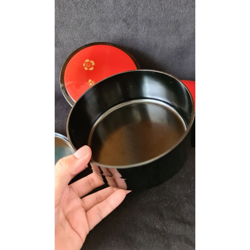 Bộ 3 thố nhựa có nắp giả sơn mài, đường kính 14 cm, sâu lòng 5,5 cm. Hàng nội địa Nhật đã qua sử dụng, không trầy, độ mới cao.Giá BORED