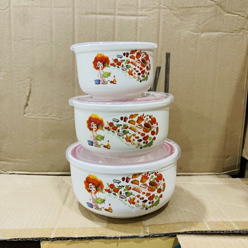 bộ 3 tô sứcó nắp đậy bằng nhựa có ron chắc chắn