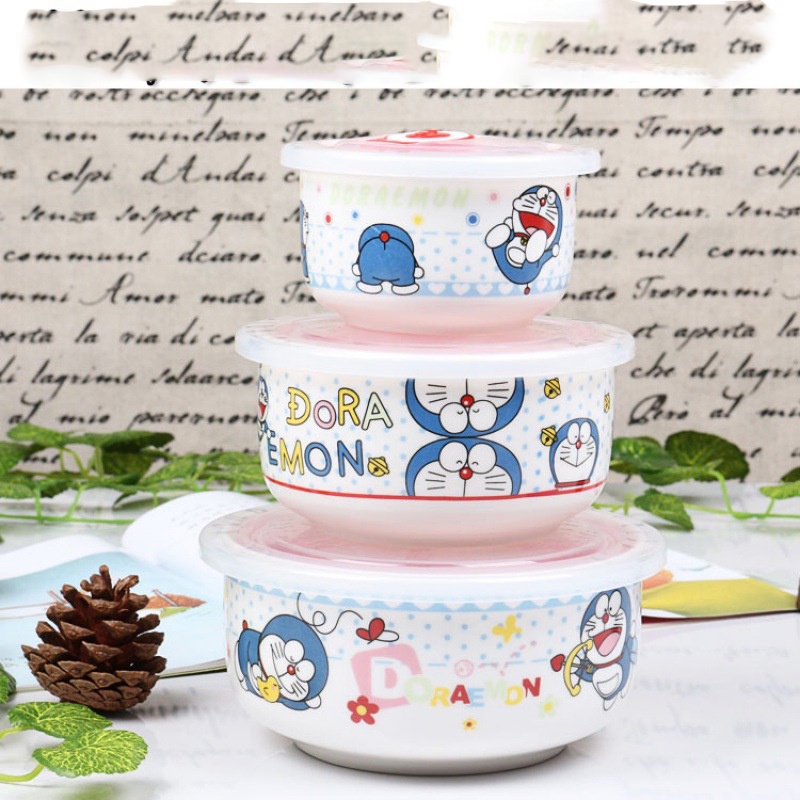 Bộ 3 thố sứ DORAEMON DOREMON có nắp đậy hút chân không dễ thương cute MON0256