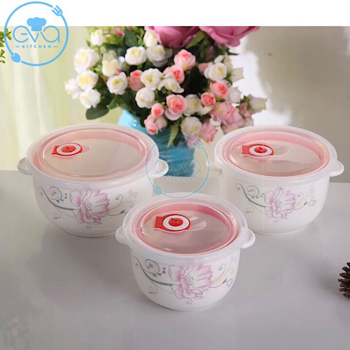 Bộ 3 tô sứ in hoa có tay cầm và nắp đậy chân không . Bộ 3 tô sứ in hoa có tay cầm và nắp đậy chân không là đồ dùng cao cấp dành cho mọi nhà.Công dụng dùng để bảo quản thực phẩm tươi trong tủ lạnh, hoặc đựng thức ăn chín để hâm nóng trong lò viba.