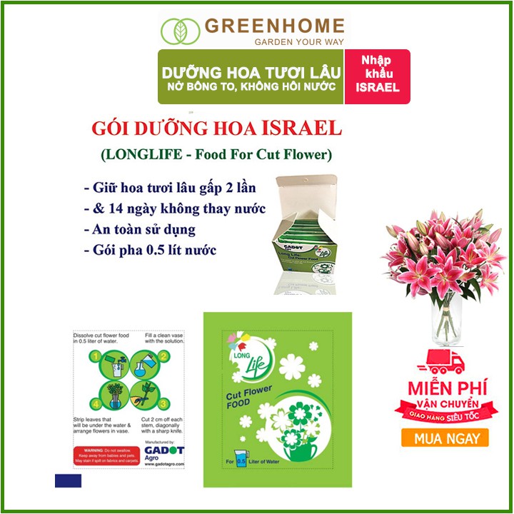 Nhà cửa & Đời sống > Làm vườn > Phân bón || 30 gói Dưỡng hoa lâu tàn Long Life, gói 5gr, hoa tươi lâu, nở bông to, không bị hôi nước |GreenhomeCòn hàng