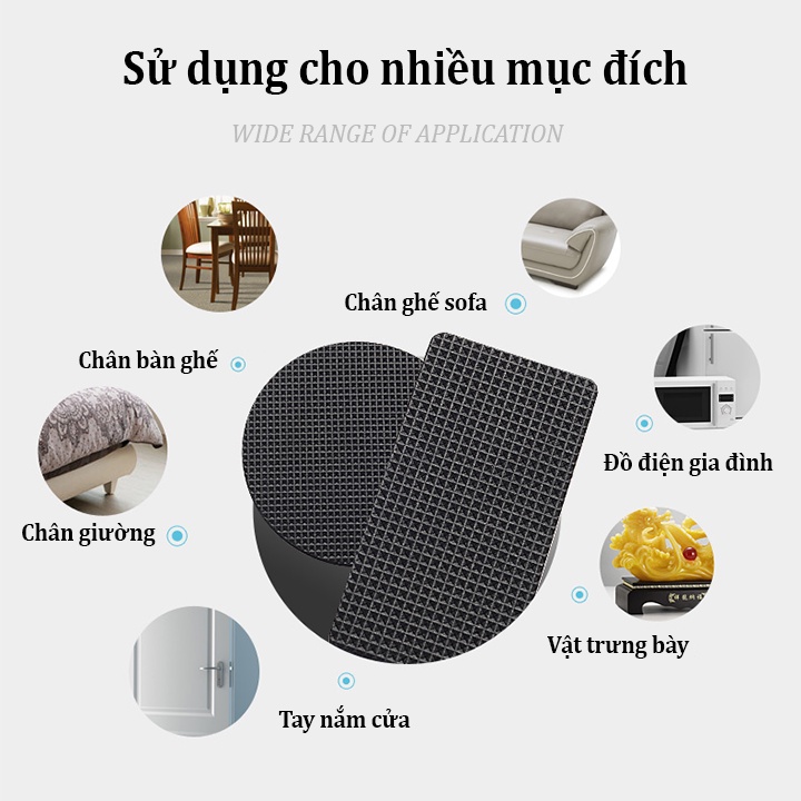 - Miếng dán chống nước chống sốc, bảo vệ chân bàn ghế không bị ẩm mốc; dễ dàng cắt chỉnh miếng dán phù hợp với mọi bề mặt và mọi kích thước.