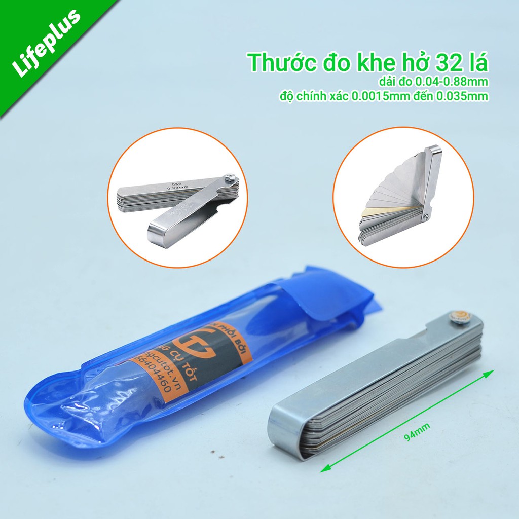 Thước đo khe hở 32 lá hay còn gọi là căn lá có dải đo từ 0.04-0.88mm, độ chính xác 0.0015mm đến 0.035mm , dài 89mm, bản rộng 13mm dùng để xác định độ rộng của khe hở bằng cách nhét lá thép vào khe hở, lá nào vừa khít với khe hở thì đấy là kích thước khe hở.