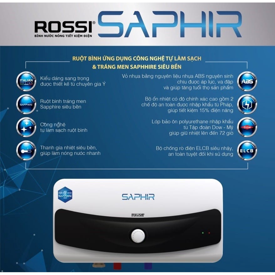 • Bình nóng lạnh Rossi Saphir được thiết kế bởi các chuyên gia hàng đầu từ Ý, kiểu dáng sang trọng và vô cùng tinh tế.