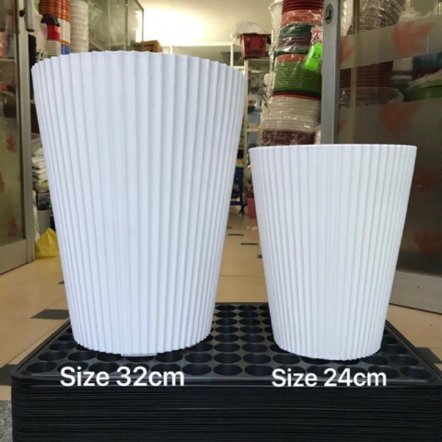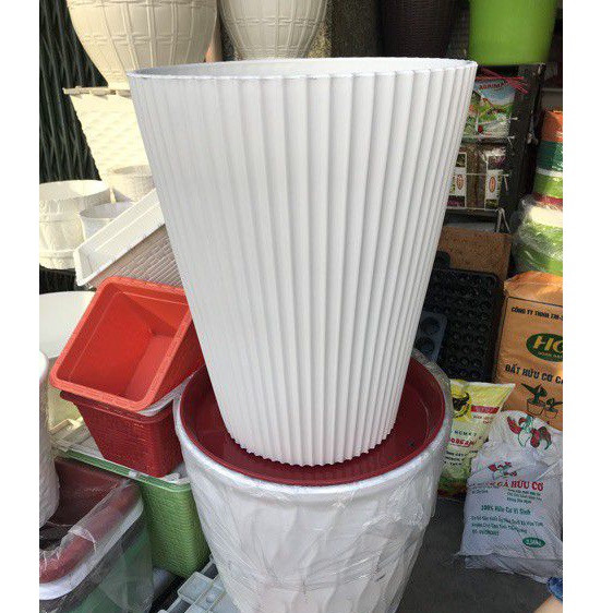 Chậu nhựa cứng, rất dày dặn,màu trắng sứ. Dáng cao và loe như hình.Chậu nhựa tròn cao kiểu dáng gân sọc nổi, đơn giản nhưng đẹp mắt,sang trọng. Phù hợp với rất nhiều loại cây cao, to, Trồng hoa, cây kiểng các loại hoặc chưng hoa giả đều đẹp, Trưng trong nhà hay ngoài sân đều rất đẹp