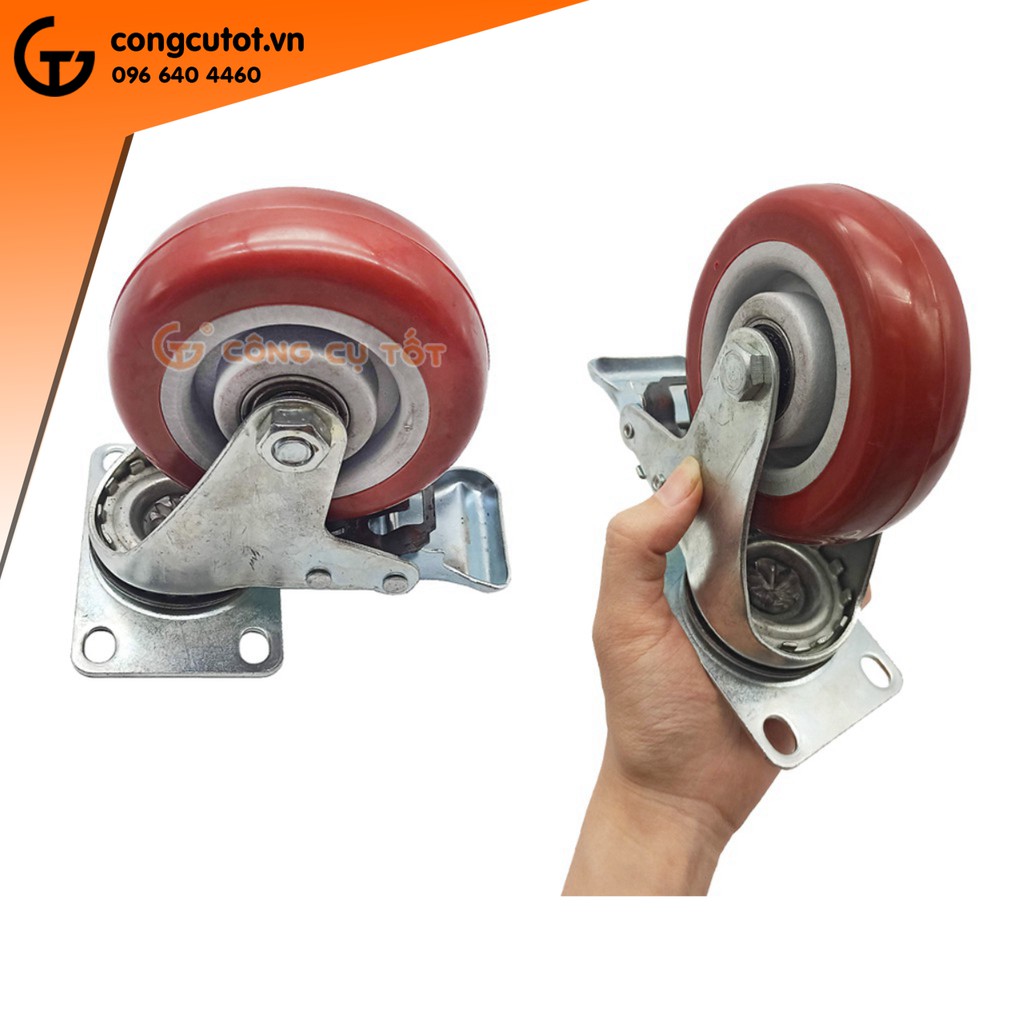 Bộ 4 bánh xe đẩy hàng tổng tải 220kg xoay 360 độ lốp nhựa đỏ mận hãm sau Φ100mm