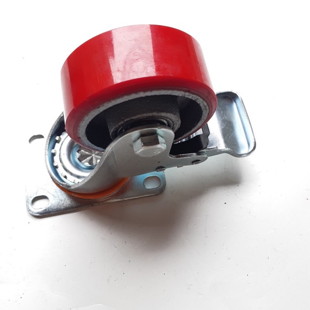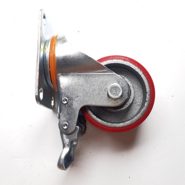 Bánh xe PU đỏ cốt gang tải nặng có vú mỡ trên cả đế càng thép và ổ xoay bánh xe giúp bảo dưỡng thuận tiện nhanh chóng. Lốp PU lăn êm, giảm ồn và có khả năng chống một số loại hóa chất nhẹ