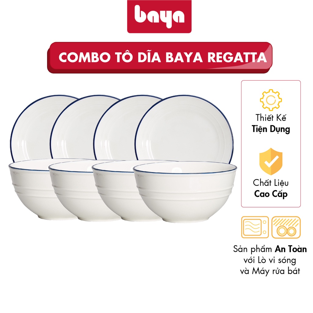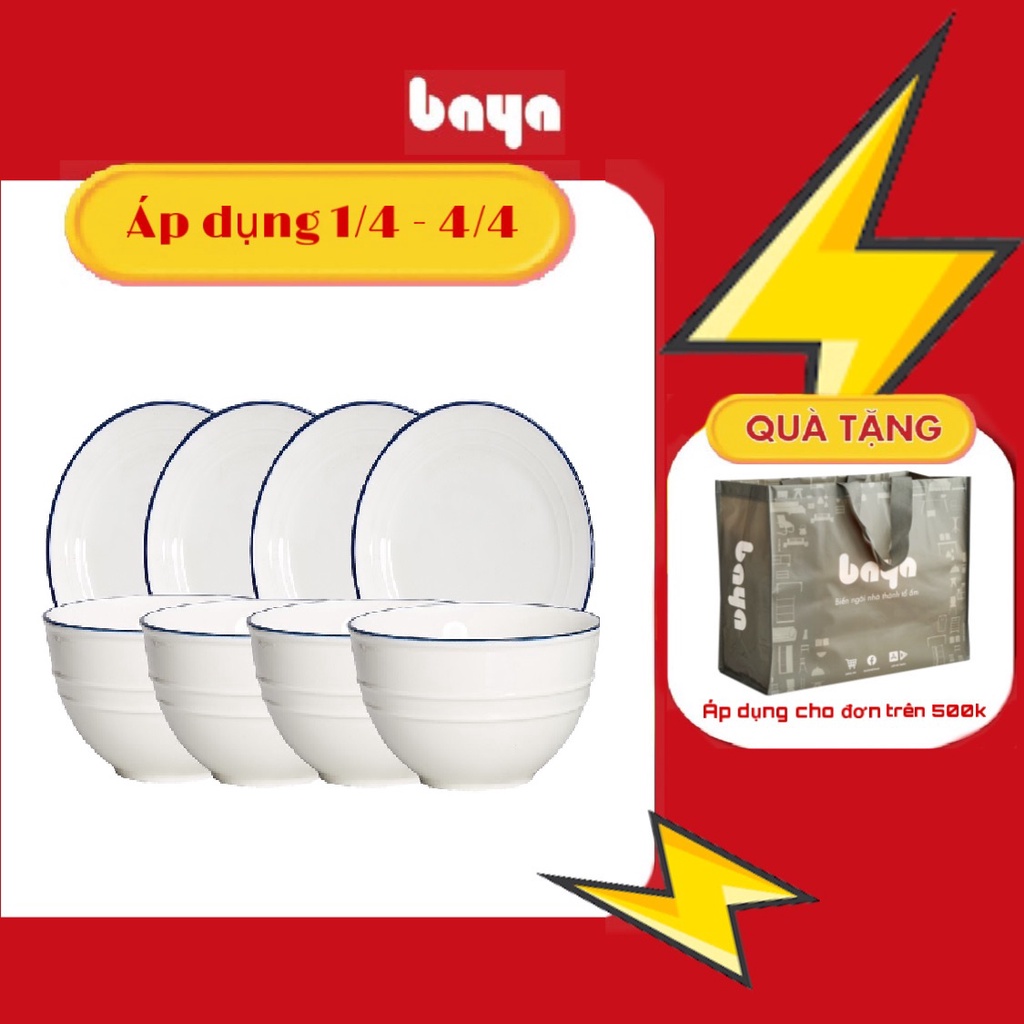Nhà cửa & Đời sống > Bộ đồ bàn ăn > Tô || Bộ 4 Bát Tô Sứ Trắng Viền Xanh Và 4 Đĩa Trung BAYA REGATTA Chất Liệu Sứ Trắng Cao Cấp 6000253Còn hàng