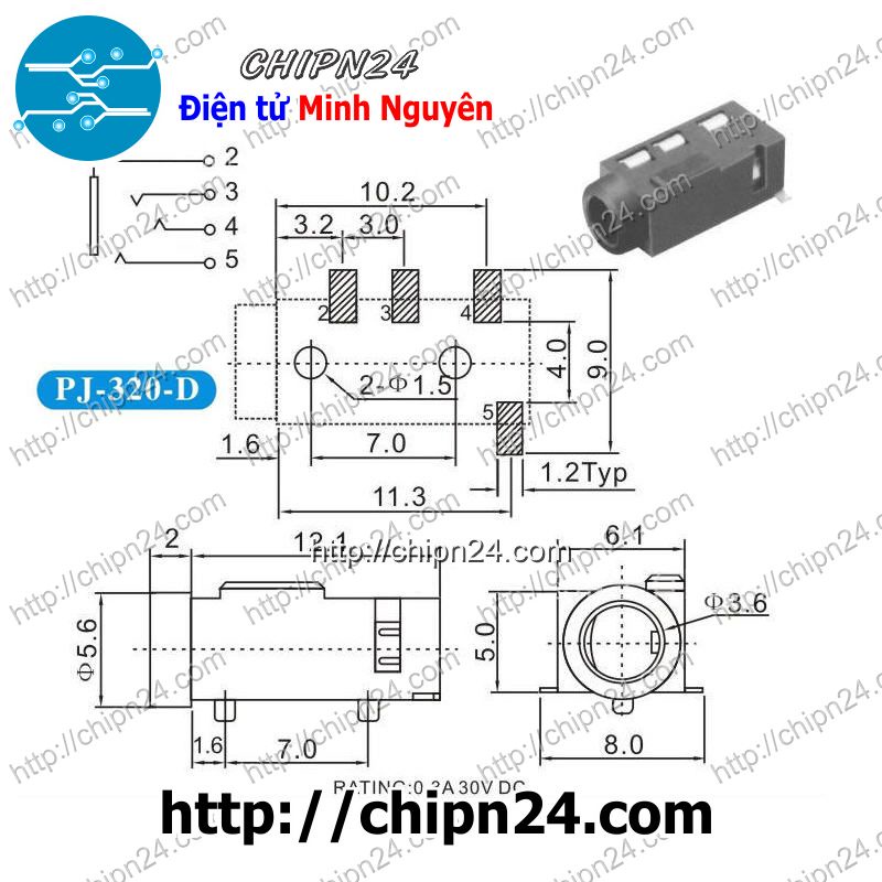 Giới thiệu [4 CÁI] Jack Audio 3.5mm PJ-320D PJ320D hàn board chân dán