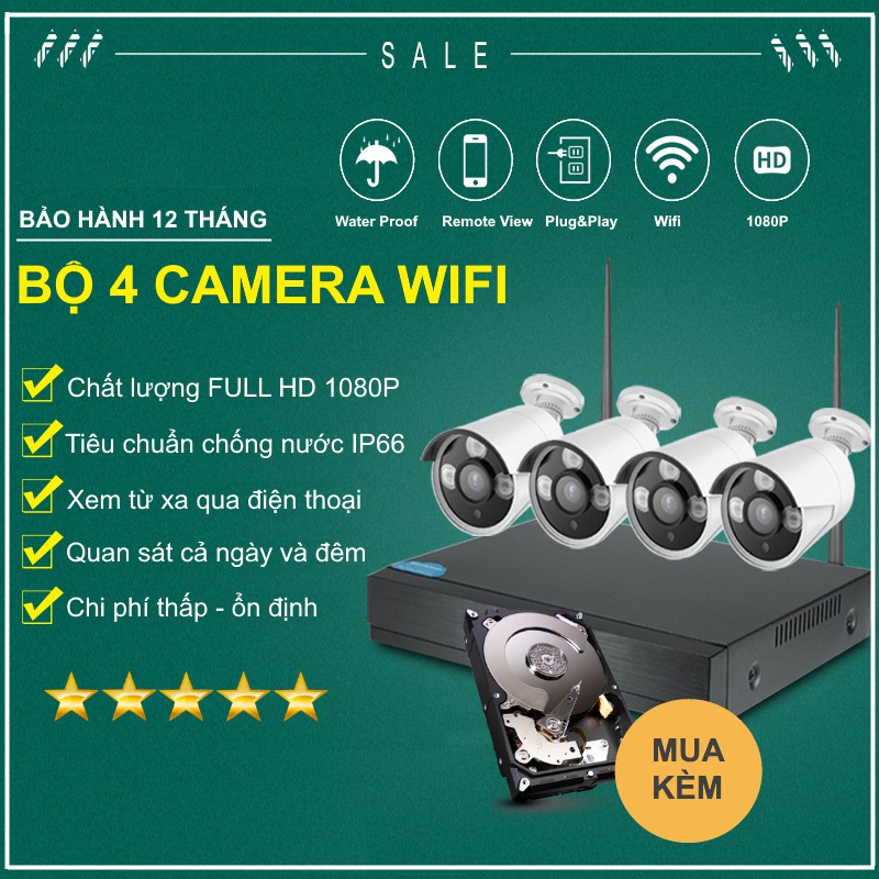 Bộ 4 Camera WIFI 1080P + Đầu Ghi NVR HD + Kèm Ổ Cứng Tùy Chọn