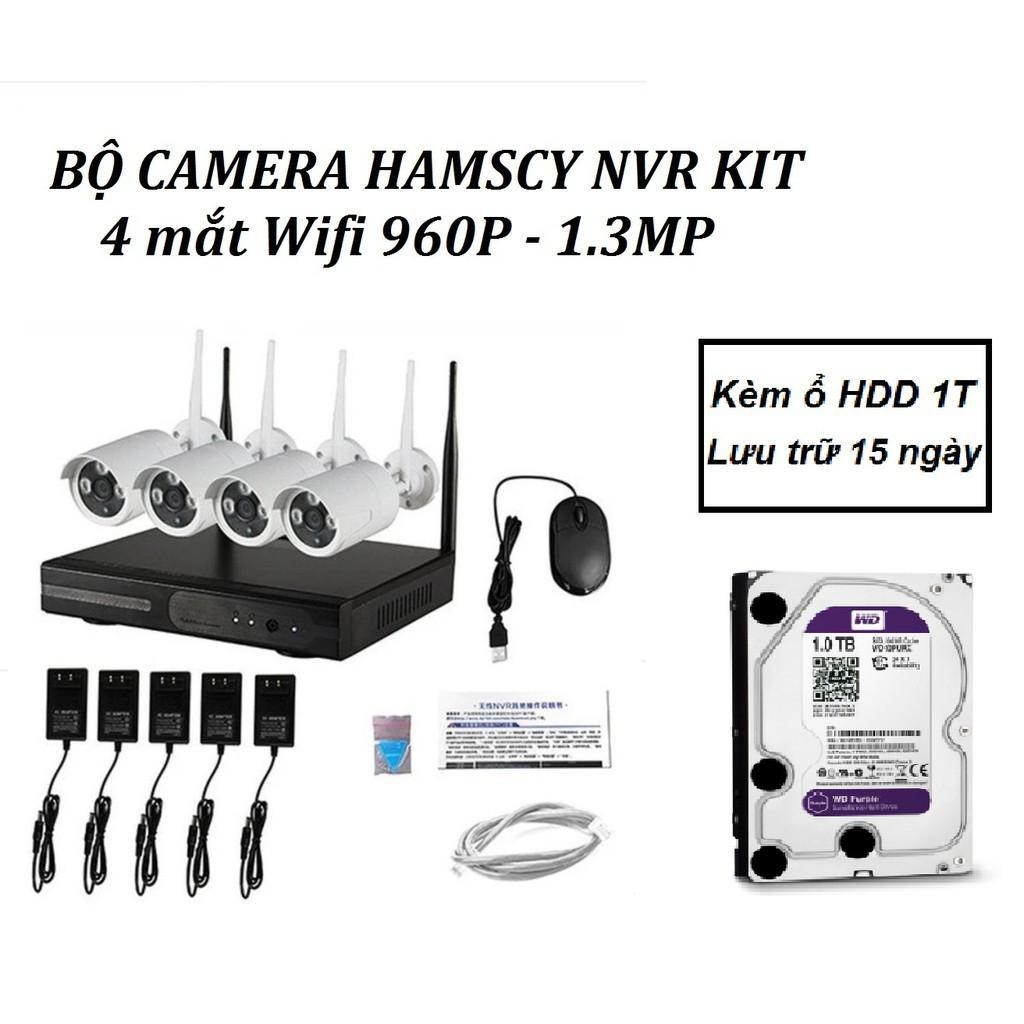 Bộ 4 camera wifi chống nước 1.3m - 960p kèm đầu ghi hình NVR và ổ cứng 1TB