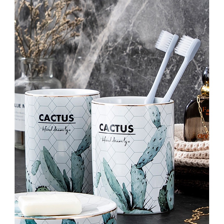SET NHÀ TẮM CACTUS SAUVAGE với hoạ tiết xương rồng tạo nên sự ấm áp nhưng không kém phần trang nhã, quý phái. Sản phẩm được làm từ sứ tráng men, viền gold mang đến hiệu ứng ánh sáng bắt mắt và sang trọng.