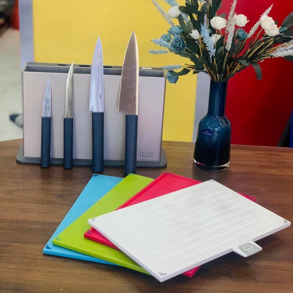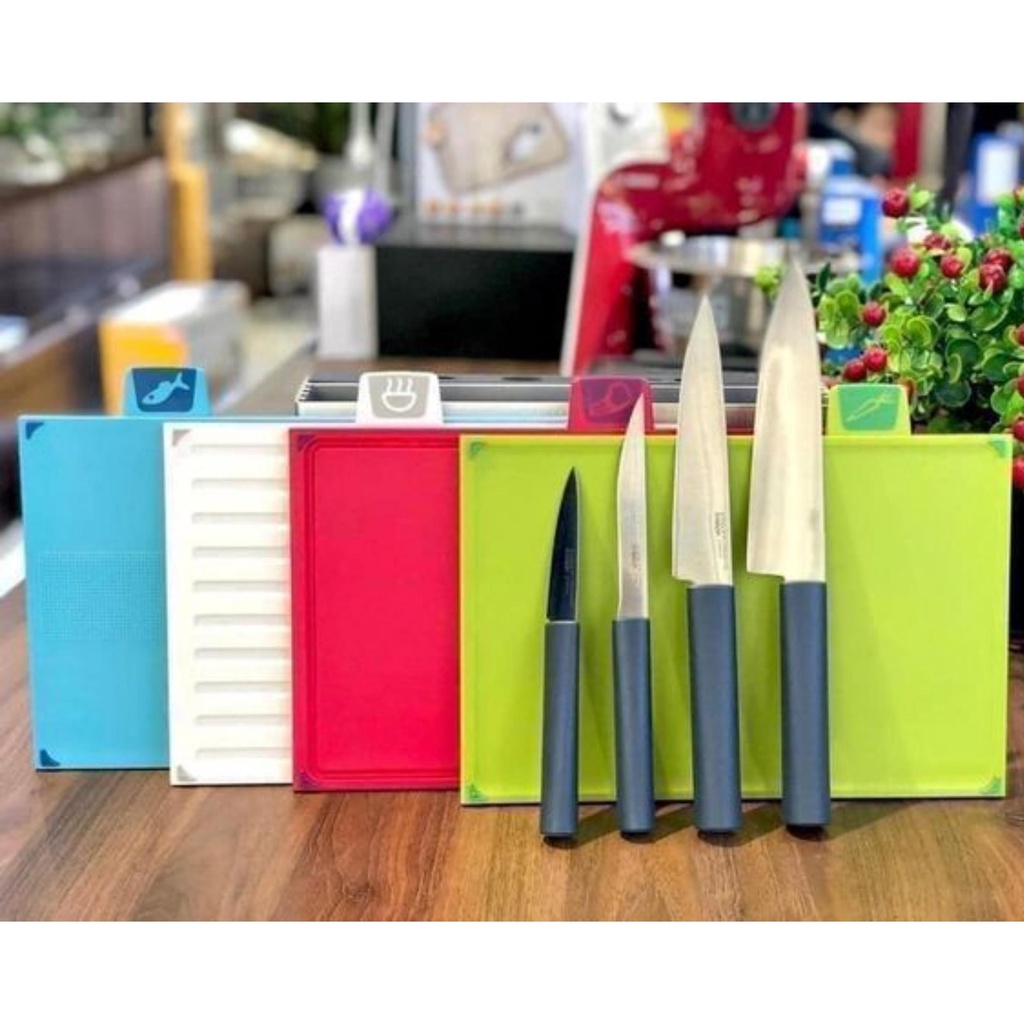 Set bao gồm 4 thớt cho tách riêng sử dụng 4 loại thức ăn (kt 30x20cm) và 4 con dao kt khác nhau (1 con 18cm, 1 con 9cm, 1 dao 16.5cm, 1 dao 13cm)