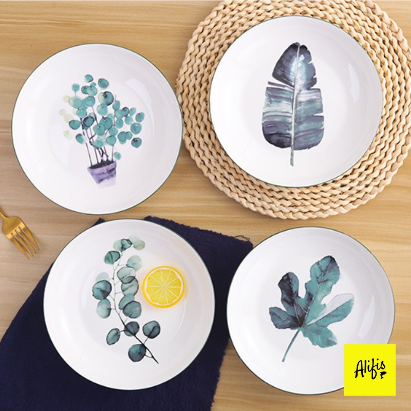 + Bộ đĩa sứ thiết kế sang trọng kết hợp họa tiết cây lá nhiệt đới siêu yêu ạ.